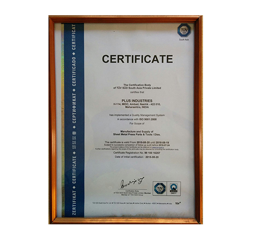Plus Industries founded by Mr. Atul Champanerkar (C.E.O.) in 2000. located in H-114 MIDC Ambad Nasik-422 010, Maharashtra in pleasant atmosphere. The area of MIDC is connected with highway as well as Mumbai ,pune and other cities. Since last 20 years we give high quality products within times. We are manufacturing sheet metal dies, jigs & fixtures, sheet metal press components, job works & assemblies. We posses a well equipped organizational structure with highly skilled expertise & professional team. continuously develop new products with our team successfully and earn customers satisfaction and new business opportunities. Today we stands powerfully at competitive market. Also we are certified by ISO 9001:2008.